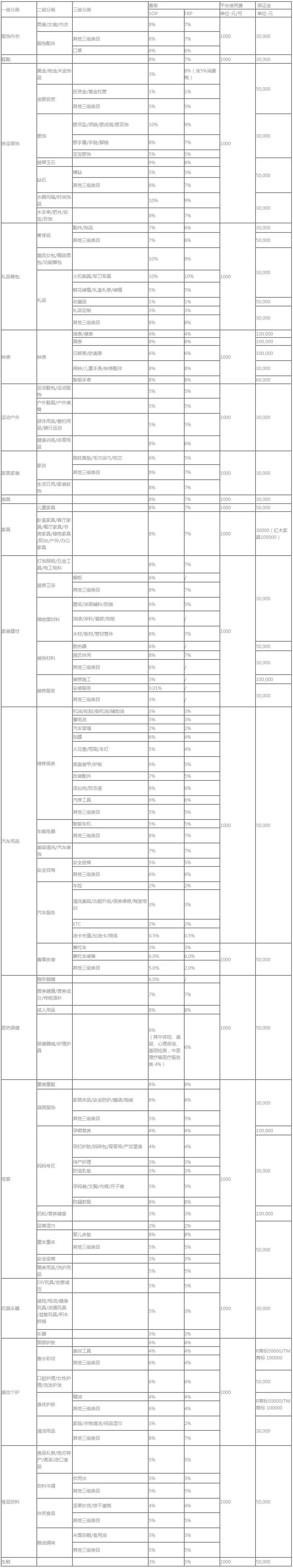 5.1.2 平臺(tái)開放平臺(tái)各經(jīng)營(yíng)類目對(duì)應(yīng)的保證金標(biāo)準(zhǔn)詳見《平臺(tái)開放平臺(tái)經(jīng)營(yíng)類目資費(fèi)一覽表》。